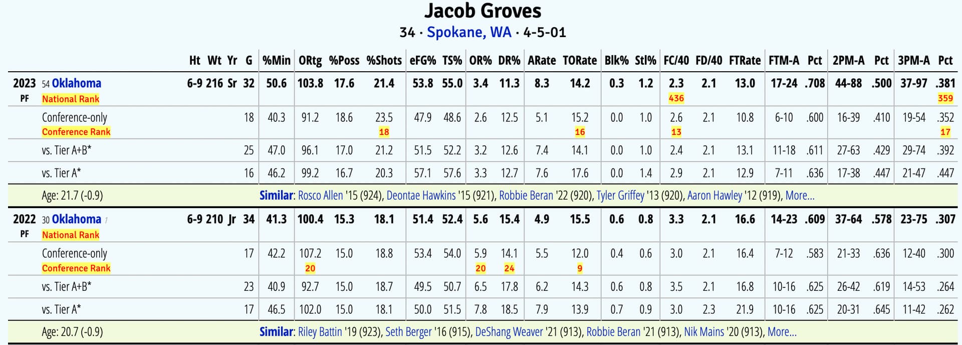 I remember Jacob Groves from the 2021 tourney when he and his brother were raining 3s for Eastern Washington against Kansas. His stats for Oklahoma are not great.