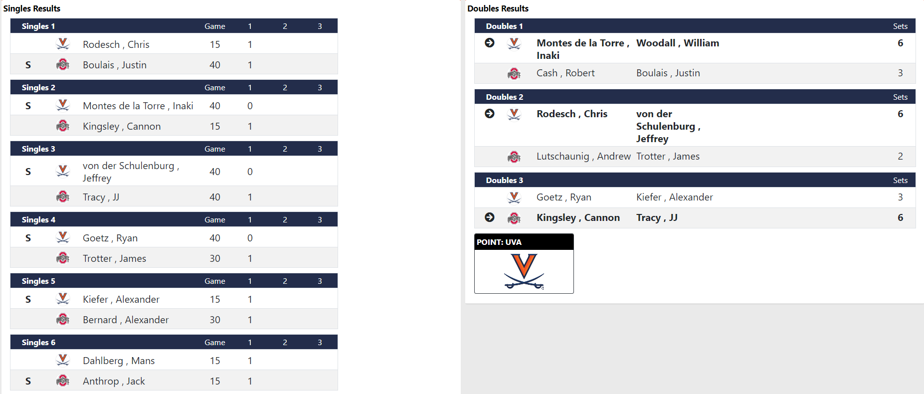 Rodesch wasn’t even playing #1 singles at that point, and he’s looked really good over the last stretch of matches. Doubles lineup was pretty different too. So I think there’s some reason for optimism.