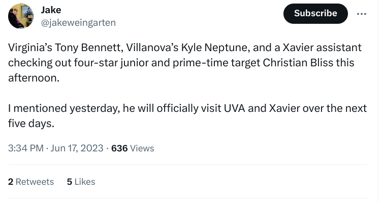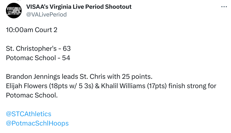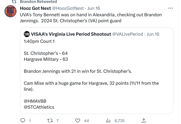 Tomorrow both PVI and Bliss dont play. So unless there is someone that caught Tony’s eye that he wants to see more of at DMV or the other two events, then I assume Tony is back at UVA greeting the new arrivals.