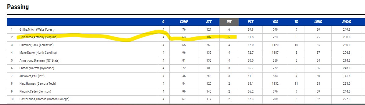 Yeah, I mean, its not JUST the QB’s talent at work, but so far Miami, Louisville, and surprisingly GT are getting the best play out of their QBs (and then maybe FSU a distant 4th), but Colandrea is in the next pack down with Maye from UNC and Shrader from Syracuse. That’s pretty solid work.