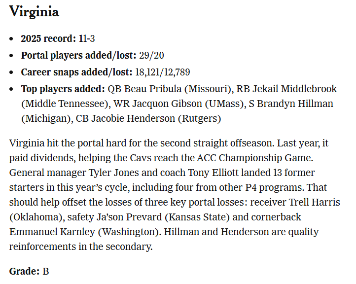 The Athletic handed out grades for the ACC portal classes. Virginia got a āBā, which is either 5th or 6th best, depending on if our B-grade is higher or lower than SMUās B. They liked the additions the Hoos made, but got dinged for losing players. I donāt think they gave Virginia enough credit for keeping the O-Line intact, but Iām not going to rail against the grade too much.