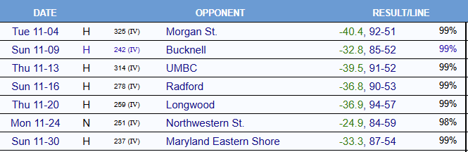 It really is dreadful. Here’s Torvik’s take on our November schedule. Check out that right-hand column. Northwestern State could be a doozy.