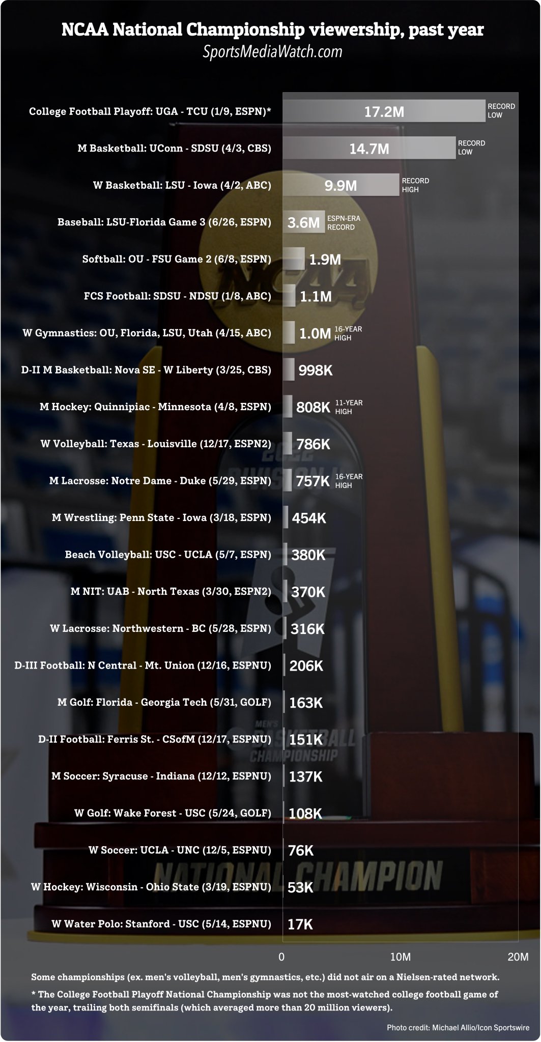 I was looking for some ratings data and found this graphic about the 2023 championships. Some of these may be outliers, because I was thinking softball had started to outdraw college baseball. And volleyball continues to gain in popularity. (It figures we aren’t even good in the non-revs that are finally becoming popular. Lol. We don’t even have gymnastics).
