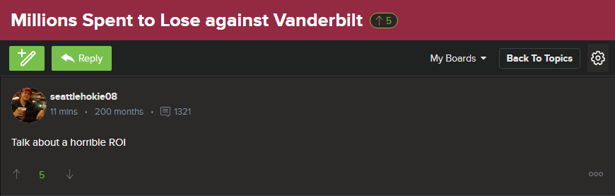 I said anything short of 10 wins would be bad for VT given all they returned and how weak their schedule is. To lose to Vandy after all that offseason hype and bravado is so funny. Like I said upthread, nothing better than VT fans having aspirations because it always ends in hilarious fashion