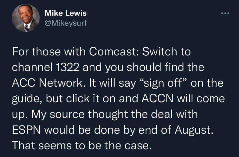 Works for me, though with the “sign off” being the only thing showing on the guide there’s no auto DVR. Hopefully they get that fixed. What a total shit show the ACC network has been an continues to be.