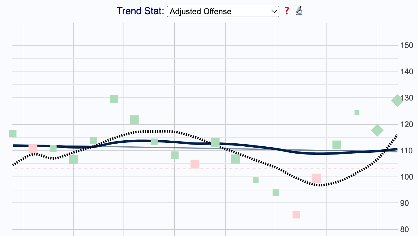 Remarkable change in our offense late in the season here. From Torvik, our adjusted offense ratings the last 20 games. That multi-game slide, culminating with the BC loss. Then a remarkable comeback the past few games.
