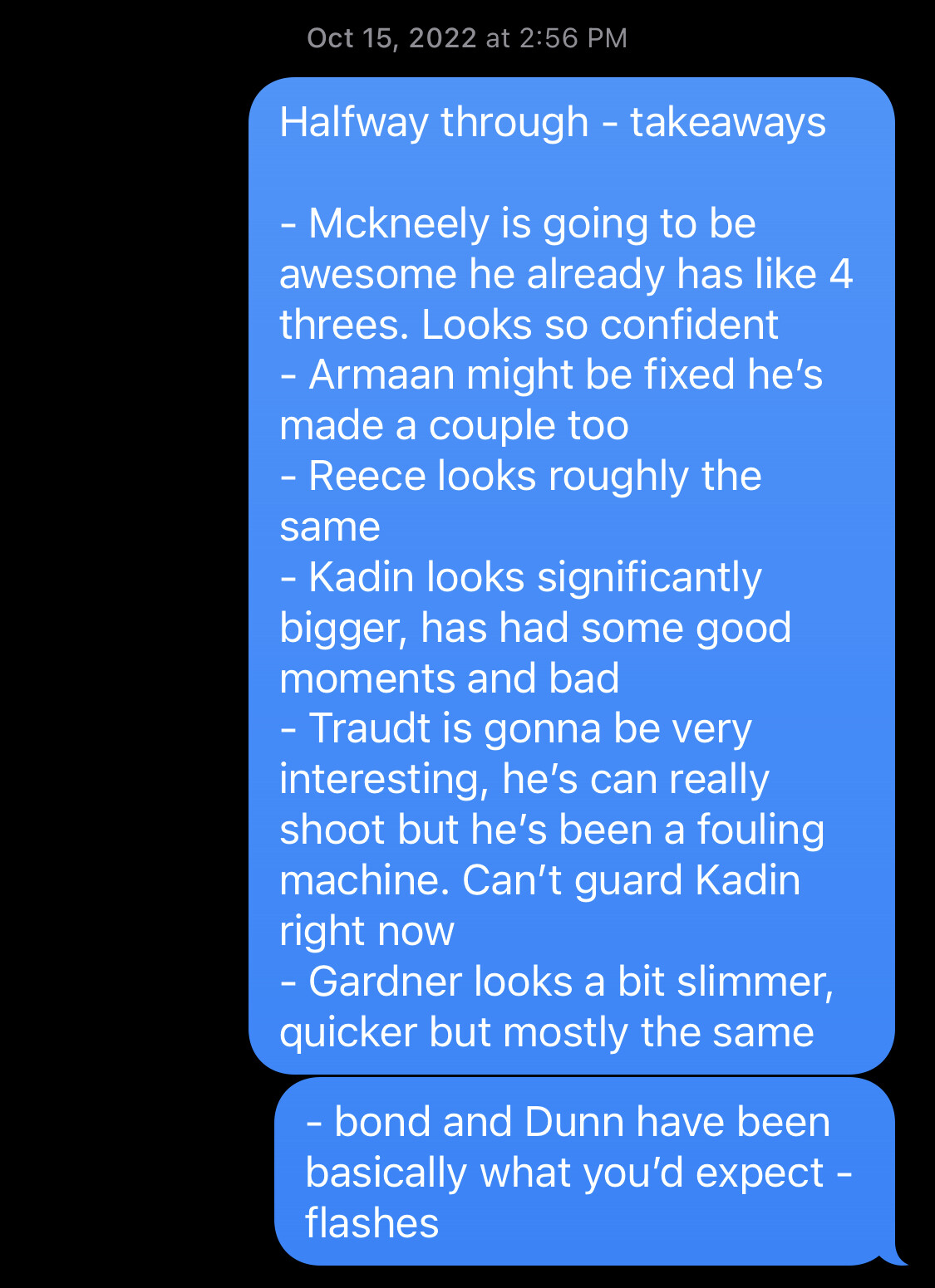 Last year I was like “Dunn is super athletic but very raw. I agree with @rushdacote that Bond is way more advance and the less likely redshirt candidate since he can help our team immediately” lol. Also thought McKneely was solid but didn’t really force the issue much and Reece wasn’t doing much. Thought Armaan looked really good but later learned it was “Armani” who showed up that day. And Traudt hit everything. Kadin looked bigger but still had no post scoring (was being defend by Dunn and even Bond at times). And Yeah Jayden slimmer was my note too @paperboy