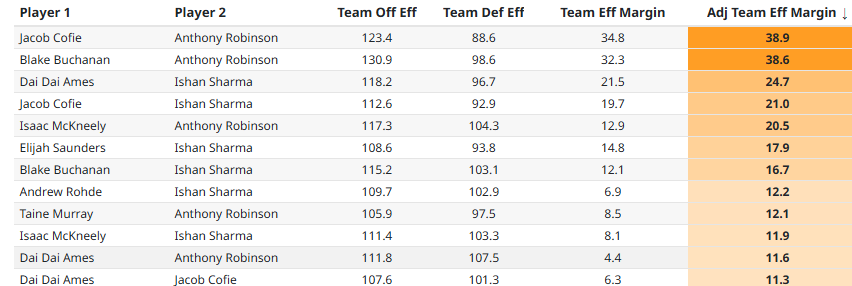Also - we really didn’t play two bigs enough early in the season to draw many conclusions, IMO. Cofie and Robinson have fewer than 50 full possessions between them. Robinson and BB only 70, BB and Cofie have 250. Meanwhile Cofie and Saunders have 430, and Buchanan and Saunders have 390 (and that pairing is the worst of any of those I just mentioned considerably so).
