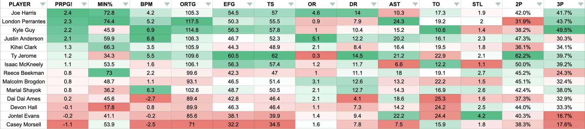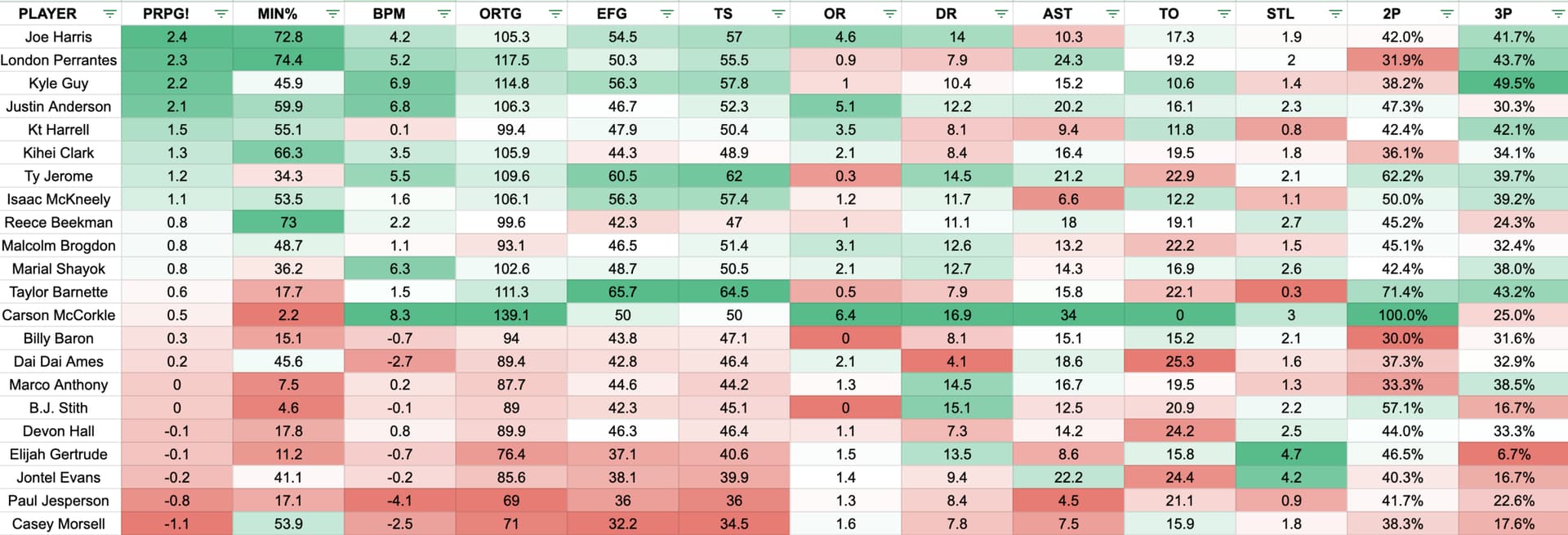 | PLAYER | PRPG! | MIN% | BPM | ORTG | EFG | TS | OR | DR | AST | TO | STL | 2P | 3P |