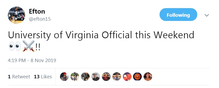 As reported prior, Efton will not be alone this weekend. 2021 forward DaRon Holmes is also expected on his official visit. Guard Peyton Watson has canceled his trip for now and will look to reschedule another time. UVA currently has four scholarships available by 2021.