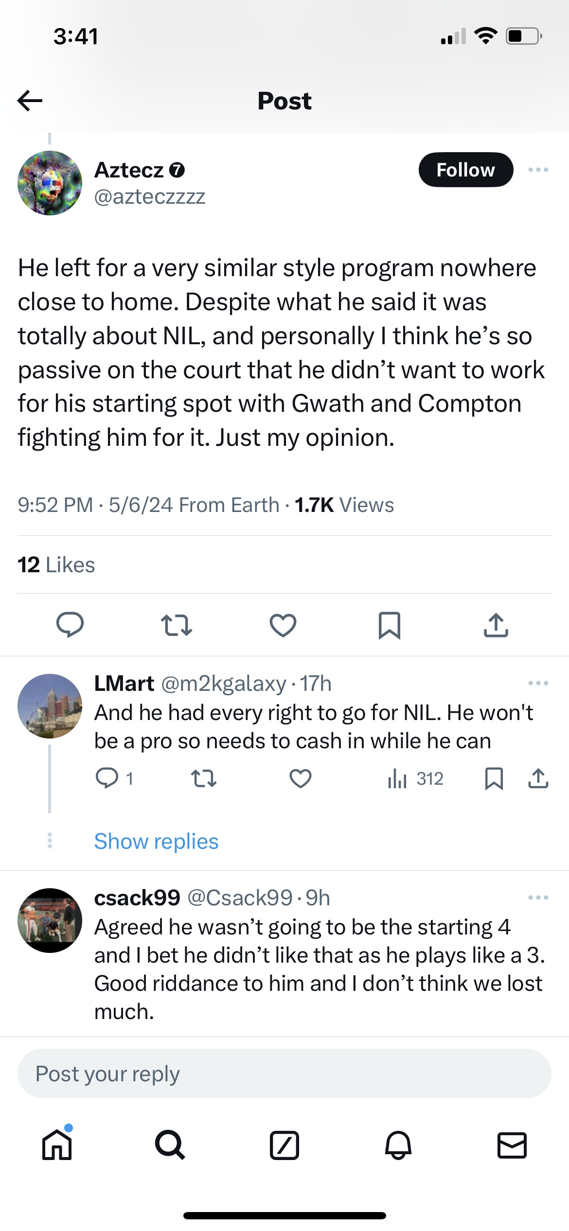 And just as of recent in his NCAA tournament games he had to guard Wolf and Clingan.