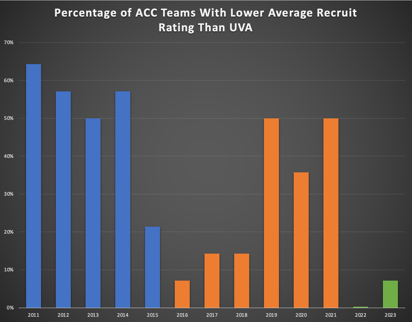 Just because I was curious, I went back through 247’s rankings and quickly threw together the below. There’s multiple ways you could look at their stuff, but I chose to look at the percentage of ACC teams who we beat in terms of average player rating in a given recruiting year. Felt like that focused on the quality of the players being landed as opposed to the number of players in each class (which affect 247’s overall ranking). I didn’t just use the average rating because I’m honestly not sure it’s consistently done across years. Only went back to 2011 because their site doesn’t seem to work properly for earlier classes.