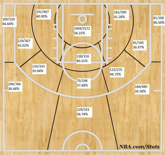 interesting that Hauser’s percentage went significantly down when he moved to the top of the key from the wing. According to all the data crunching that’s been done on 3 pt shots from different angles along the three point arc from the baseline to the top of the key, it’s kind of a bell curve, with the most accurate from the short corner, dropping to least accurate from 45 degrees, then rising again when moving toward the top of the key.