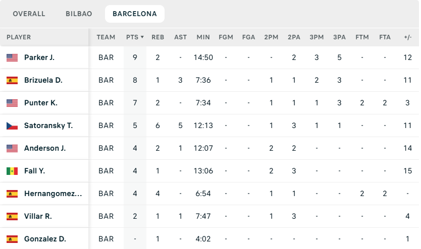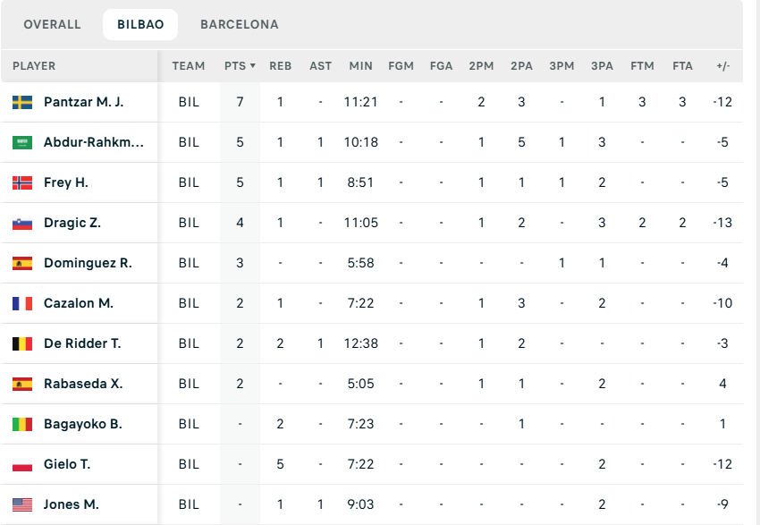 Probably obvious, but Barca is just another level from Bilbao, talent-wise. MAAR from Michigan, Cazalon from our old rival Mega, and De Ridder VS. multiple NBA vets (Hernangomez**, Jabari Parker, Justin)
