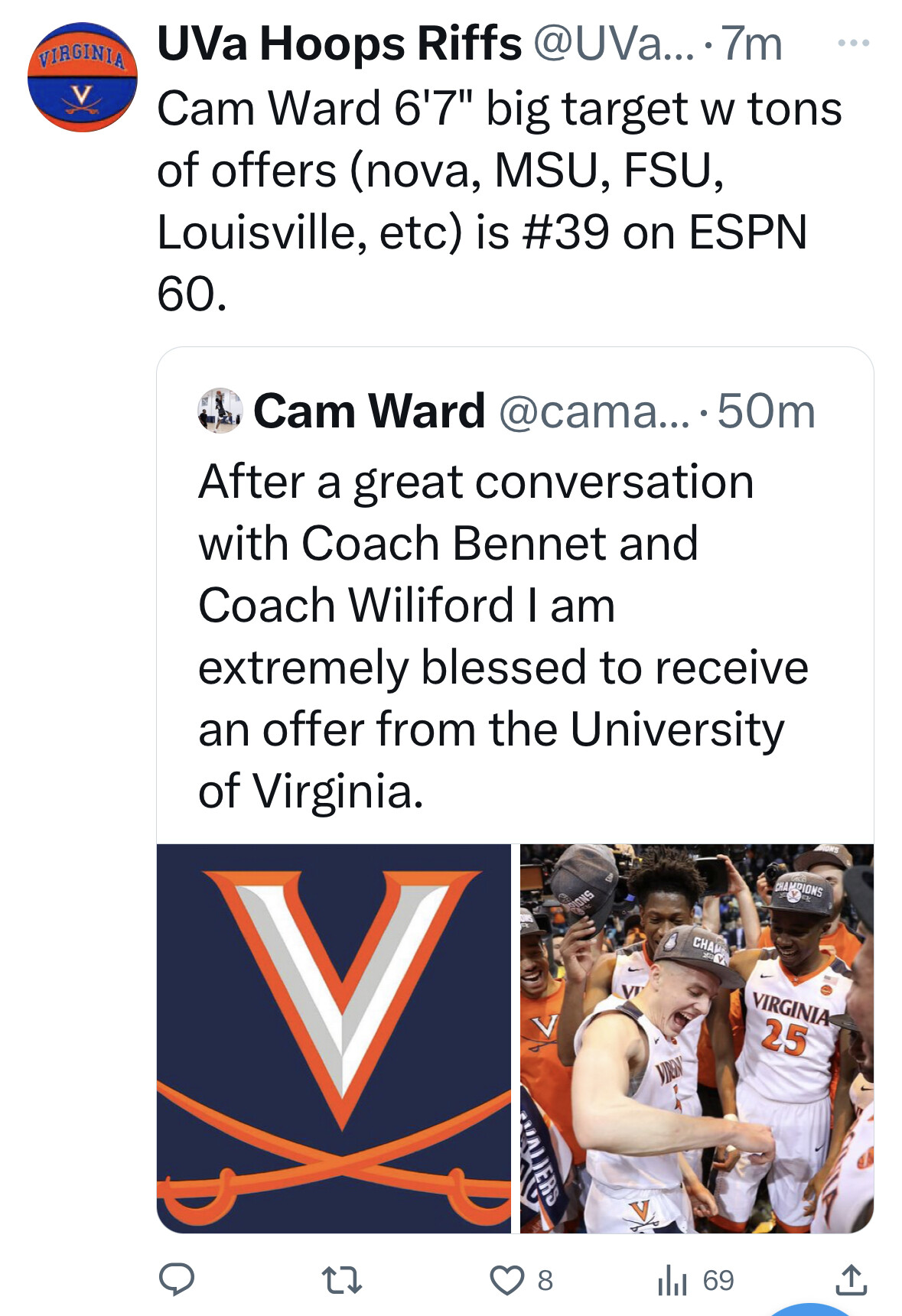 Multiple unofficial visits. UVA coaches are around all the time. He could reclassify.