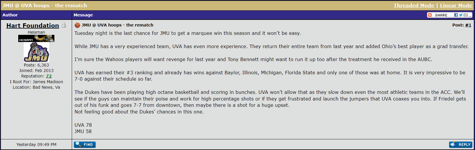 This is their super bowl. I expect a close, stressful game where we are down at half and where we pull away finally at the end. This is always how these games go with UVA