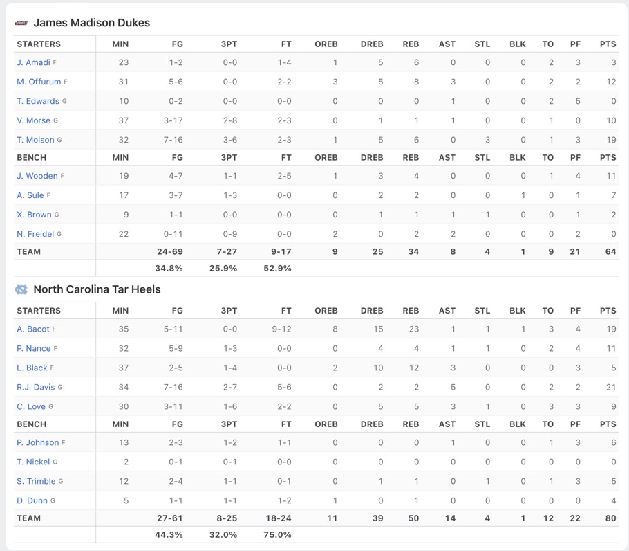 I think their game against UNC is instructive. Both teams shot poorly from 3, and, while UNCās 44.3% overall was not great, it was much better than JMUās 34.8%.