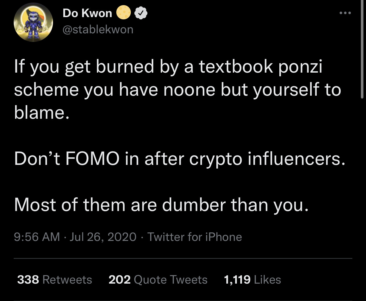 A pretty great tweet from the archive of the mastermind (lol) behind Terra and Luna