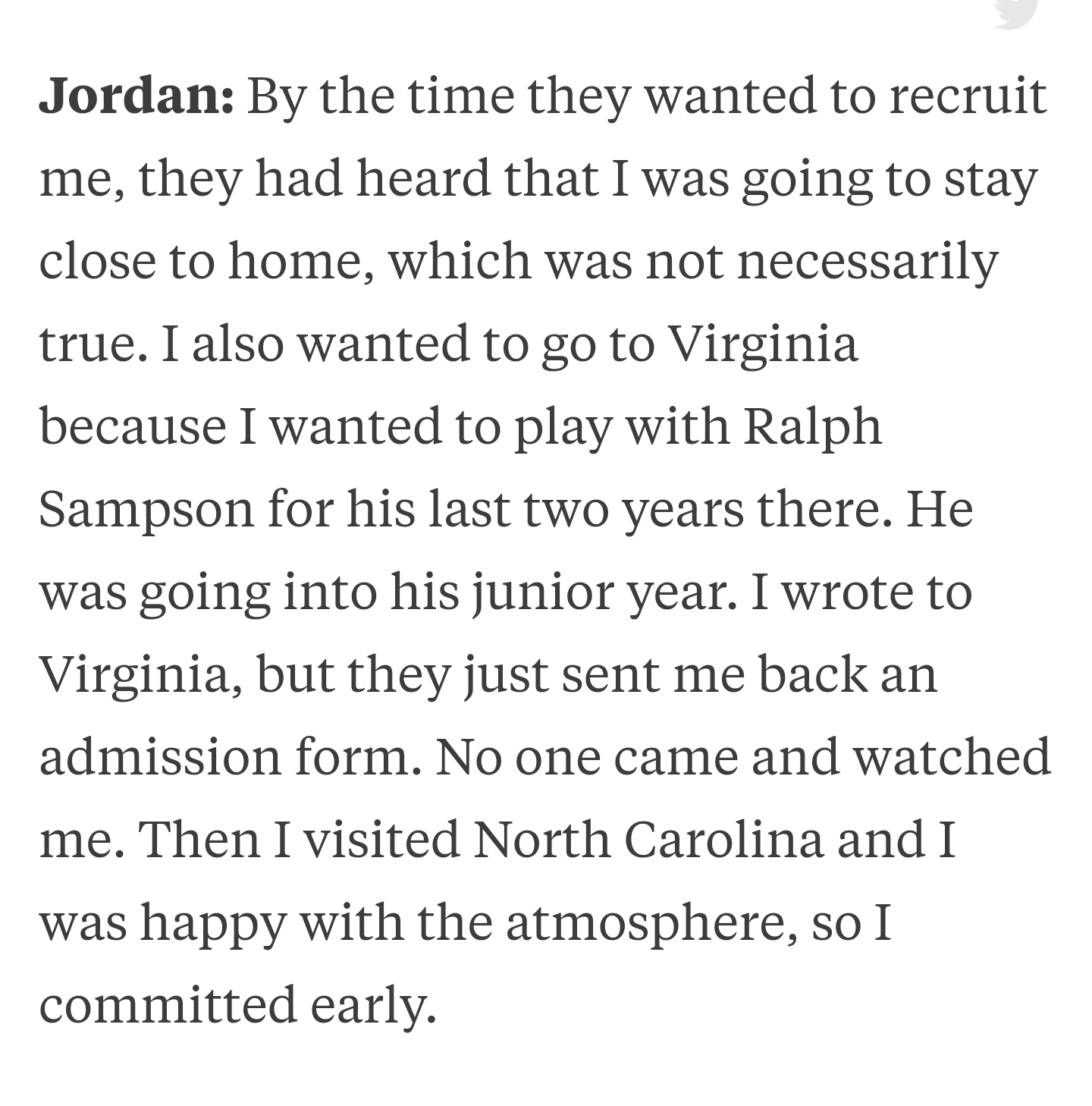 That whole story is something that Jordan made up about “almost” going to UVa. If Dean Smith had told Jordan that he’d have to walk on, and pay his own way for 4 years, Jordan would have still gone there.