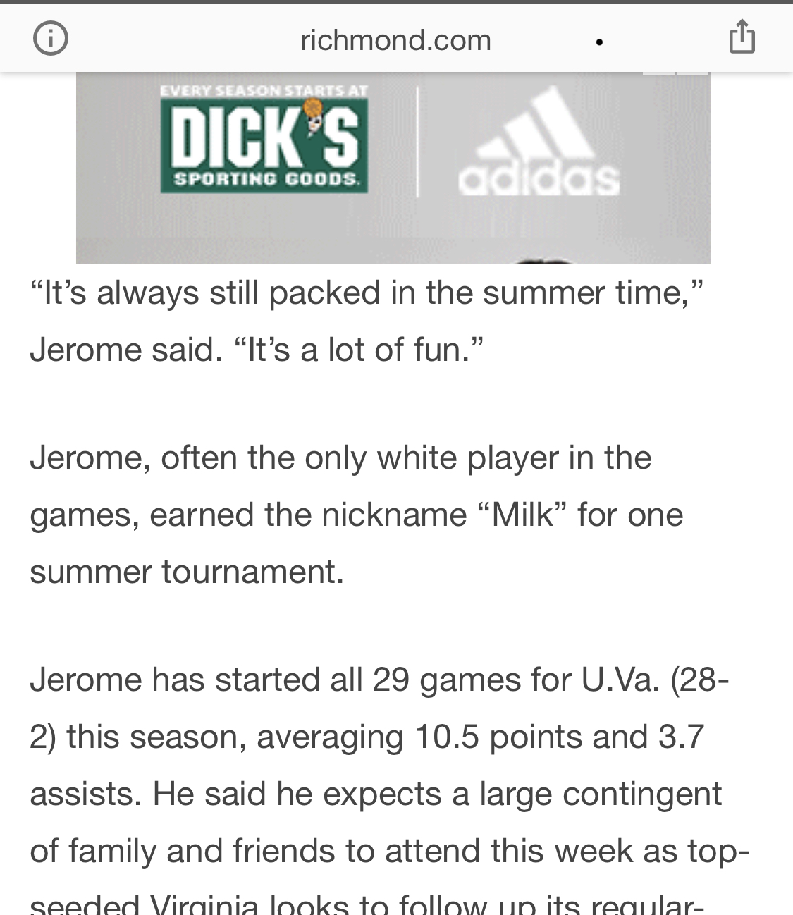 “Jerome has started all 29 games for U.Va. (28-2) this season,…”