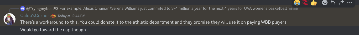 Maybe if NIL is still a thing even if stringent, Ohanian could have the womenâs players do advertisments for his brands for the $3-4 million and it would be separate from the 20 million cap