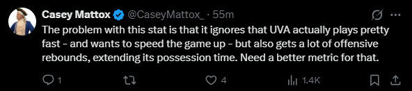 Is there not a better way of determining tempo that doesn’t make it look like a team that gets a good amount of offensive rebounds (extending possession time) likes to play “slow” on offense? We need a stat for time elapsed before first shot on offense.