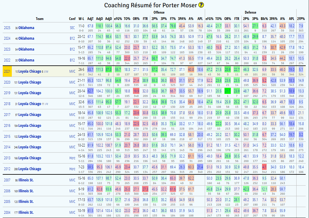 Hereās Moserās coaching history overall. Heās improved most places heās gone, except for Oklahoma where heās kept them pretty stable.