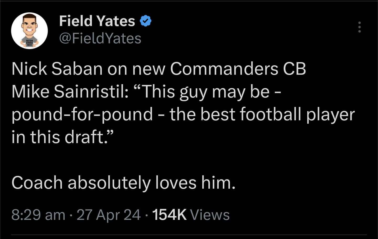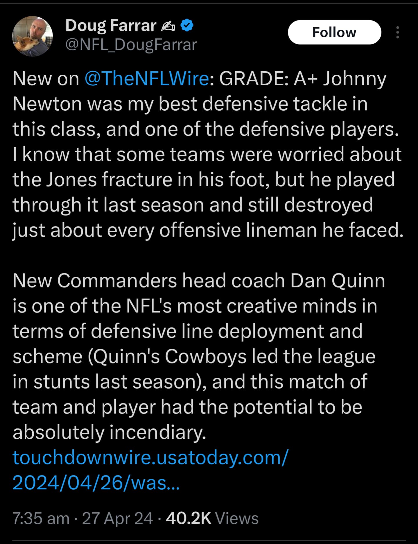 Love the Redskins (sorry, Iām old school) taking Daniels. Still need an OT & CB, but with 5 picks tonight in the 2nd & 3rd should be able to fill those gaps. Also wouldnāt mind seeing us package a couple of those picks to the 9āers for Aiyuk, who is like a big brother to Daniels from their Arizona State days. Aiyuk/McLaurin would be one of the better WR duos in the league.