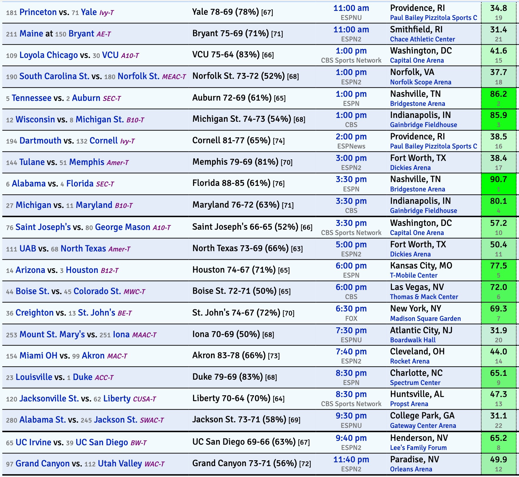VCU (25-6, 15-3; NET: 32, SOR: 49): The Rams, as is their wont, cruised past a solid but overmatched A10 foe Friday — in this case St. Bonaventure, whose defensive system tends to encourage opponents to launch as many 3s as they like. VCU obliged, though it shot just 9-of-32 from deep. It still won going away. We’ve bumped the Rams up to should be in, because we don’t think they’re in the genuine bubble mix, but let’s see how things go against Loyola Chicago tomorrow (and elsewhere on the bubble) before we consider the possibility of a lock.