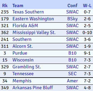 But check out all those SWAC teams⦠theyāre full-time road-trippers. Mississippi Valley Stateās first home game of the season is Jan 6. Alcorn State played an NAIA team at home on Nov 8, their next home game isnāt until Jan 20. These dudes earn their scholarships for sure. If the Washington Generals were in a conference, it would be the SWAC.