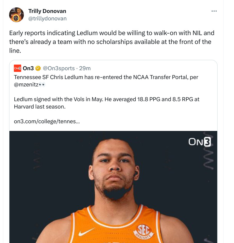 if you’re a serious basketball power with decently deep pockets and enthusiasm for NIL, scholarship vs walk-on is purely an accounting distinction. Depending on the school and circumstances, the scholarship is basically worth $40-80K/year, right? If your NIL pockets are deep enough, that’s not a problem.