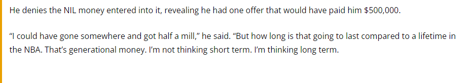 And this is 100% BS. He’s a good player and maybe does have an outside chance at playing in the NBA some day, but no way anybody offered him $500K.
