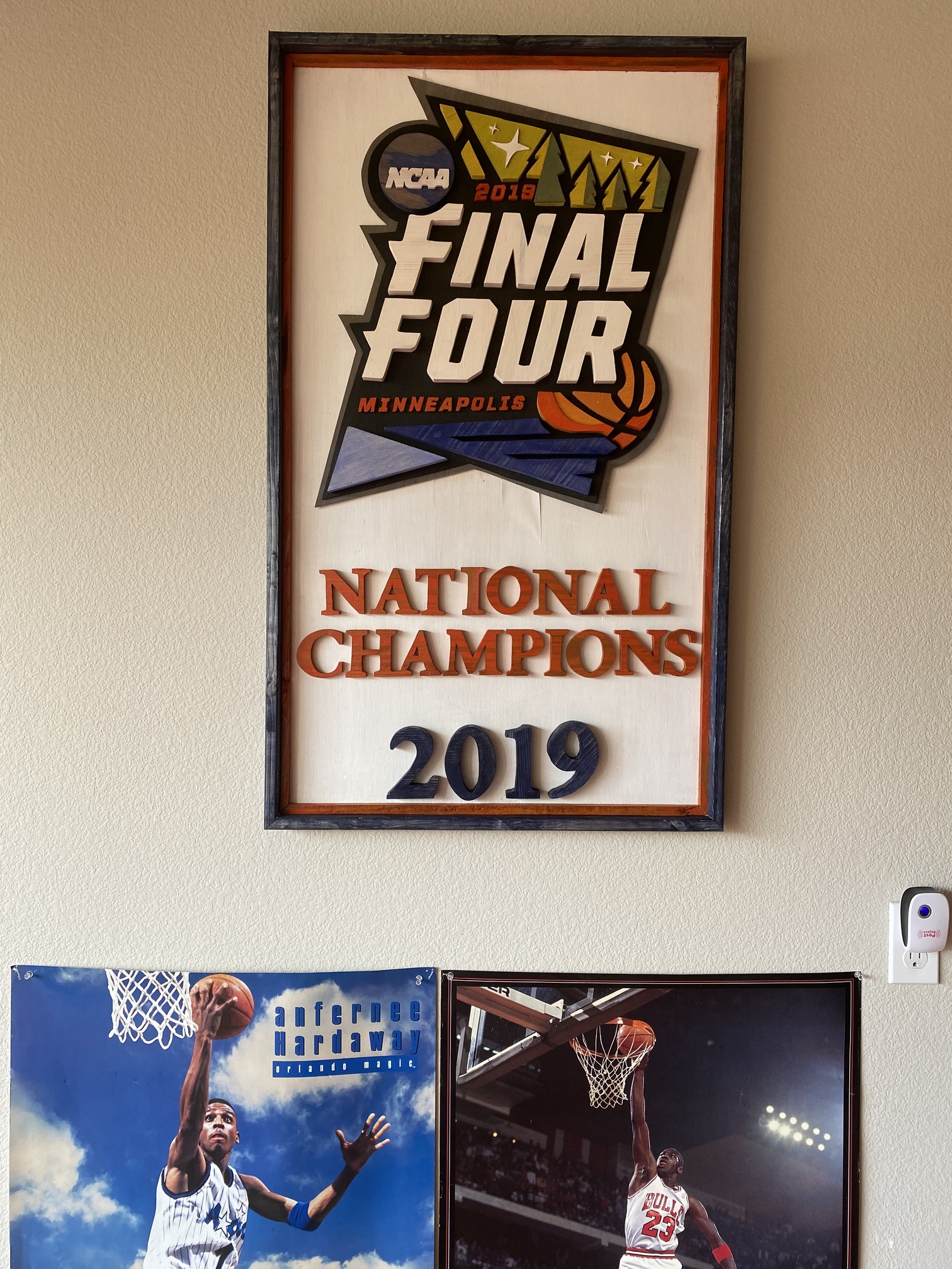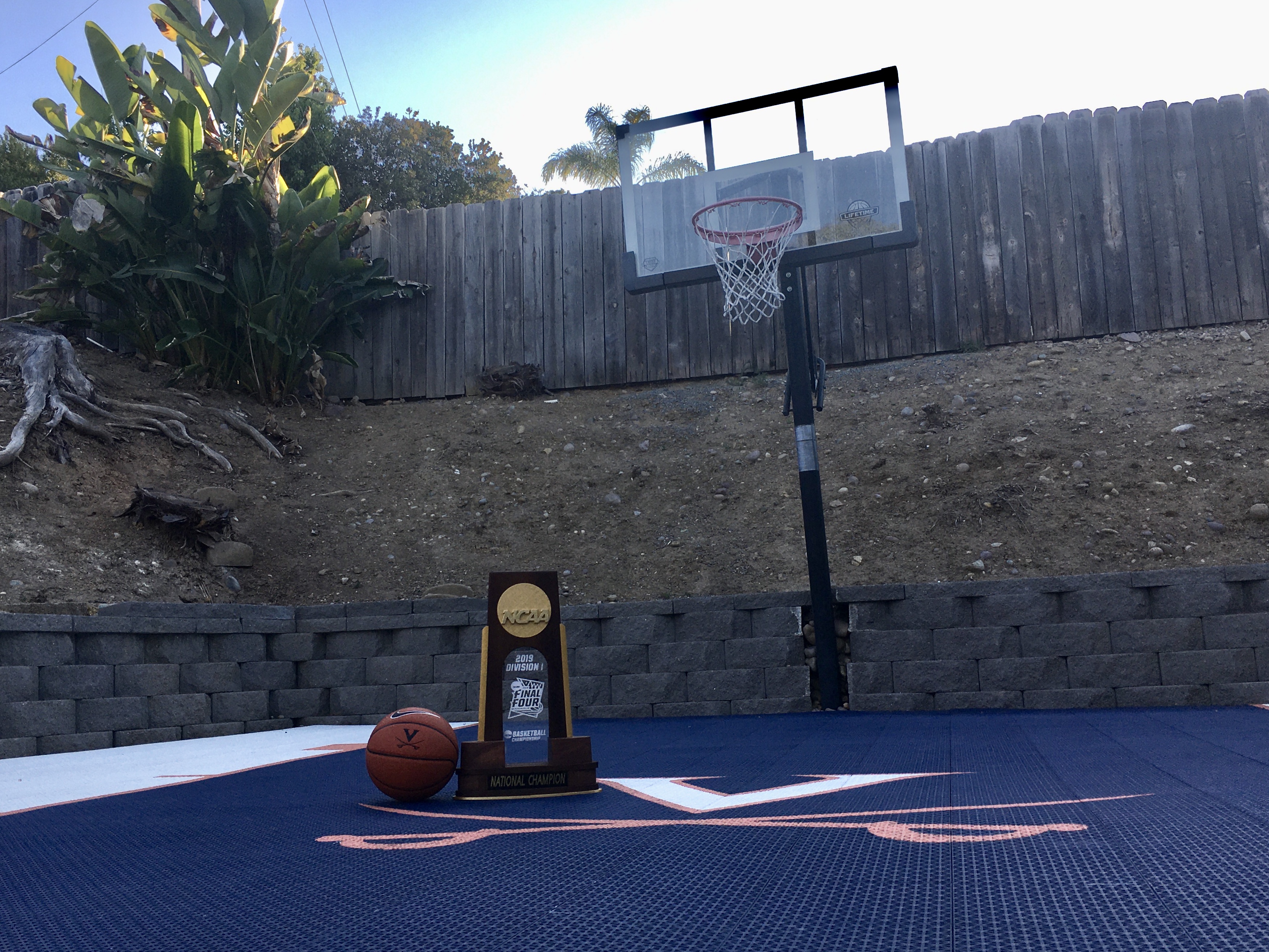 Here is a pic of a couple of “quarantine” projects - repainting our b-ball court and making a replica national championship trophy.