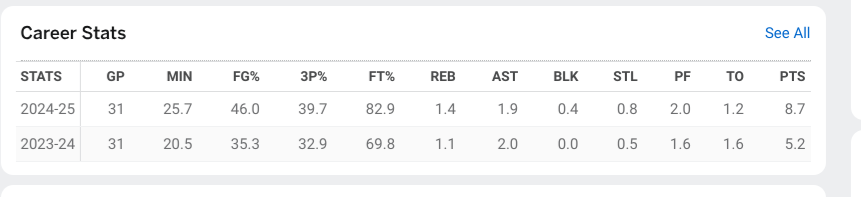 A proven shooter based on made baskets, not just percentage but also avoiding shot chuckers (guys with eligibility that have 3.0 makes per game, shooting 37% or higher)