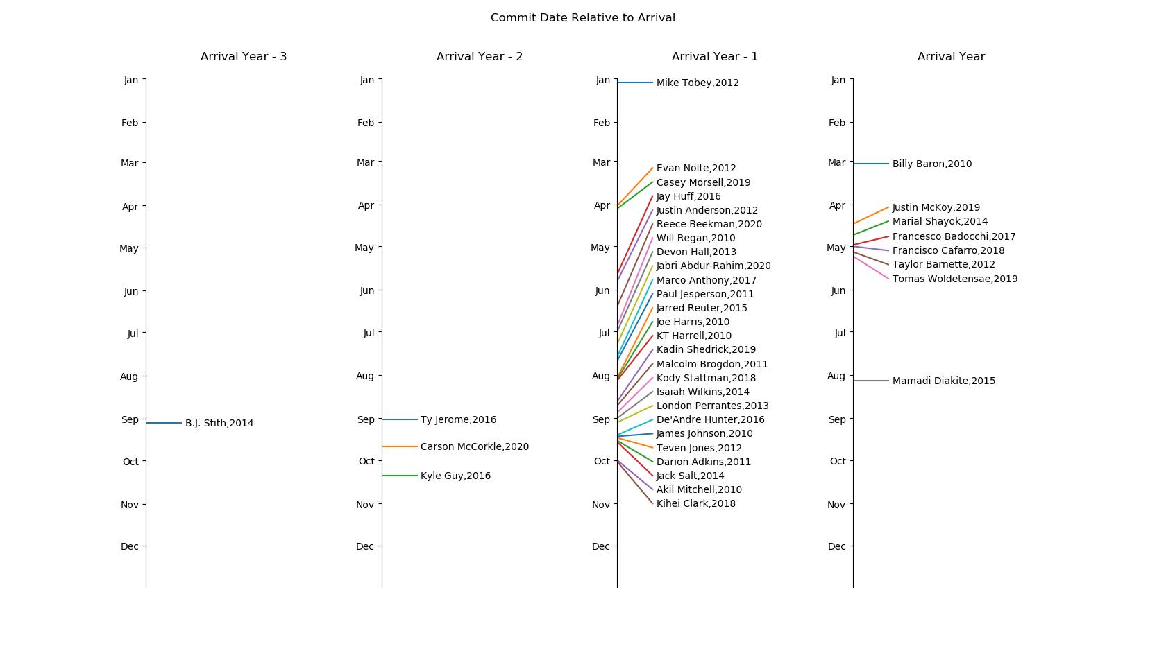 Piggybacking on @Daniel_G’s analysis that kicked off this thread. I thought it would be interesting to visualize history of commitments within the recruiting cycle. This chart is a timeline for all of Bennett’s recruits. I hope it’s clear enough. Everyone enrolls Sept of “Arrival Year” on the right. “Arrival Year - 1” covers spring of high school junior year and fall of senior year. And so on. So for example Ty and Kyle committed in the fall of junior year, and Malcolm committed in the summer before senior year.