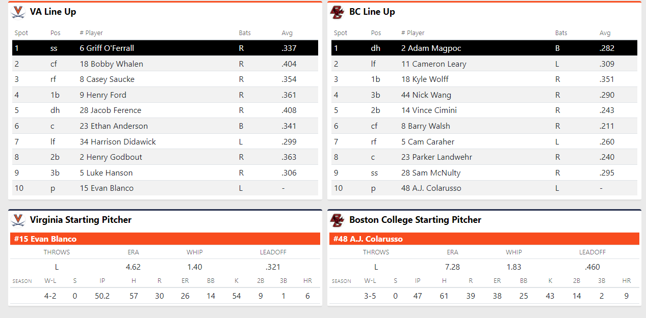 Top of the 1st, LHP AJ Colarusso starts on the mound for BC. SS Griff O’Ferrall leads off for the HOOS.