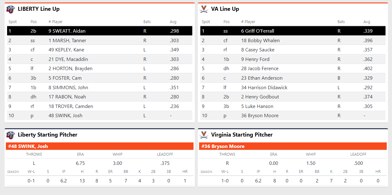 Top of the 1st, RHP Bryan Moore starts on the mound for the HOOS. 2B Aidan Sweatt leads off for Liberty.
