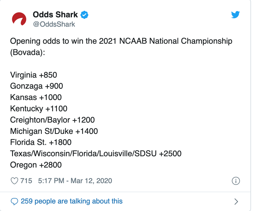 I think we have great chance to win in 2021. But not liking these payoff odds so much. I can see placing a bet to win on Virginia EVENTUALLY. But I expect the betting odds to change and that UVA will become a longer shot to win and, if so, one would get higher odds for a larger payoff on a bet placed if you wait.