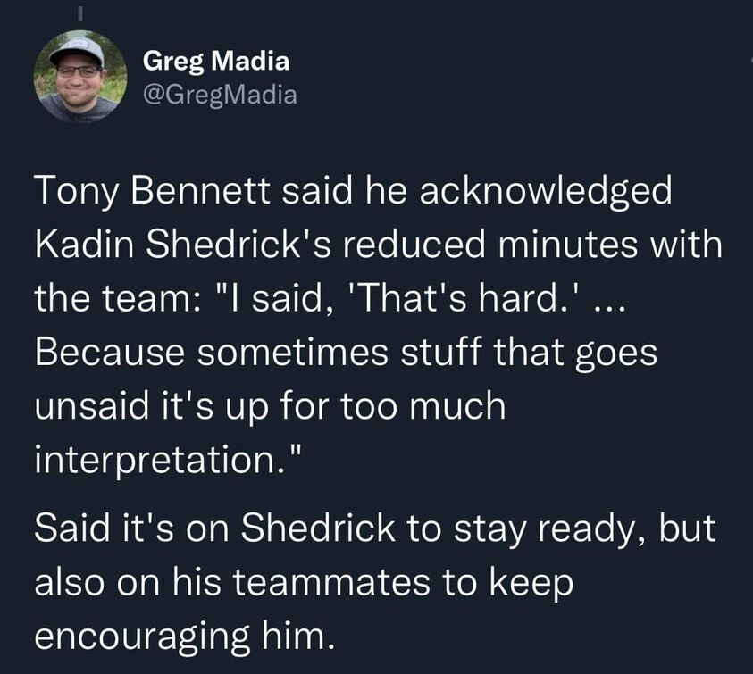 That is so puzzling to me. He looked totally fine and comfortable out there. It’s like we’ve eroded all of his confidence too because in warmups my guy has a silky smooth jumper and they leave him wide open at the FT line every game. It’s a travesty that part of his game hasn’t been utilized and that says nothing about his b2b game which is nonexistent. Not sure what part of that is on him or the coaching staff but it’s something that I’m worried we’ll just never get to see