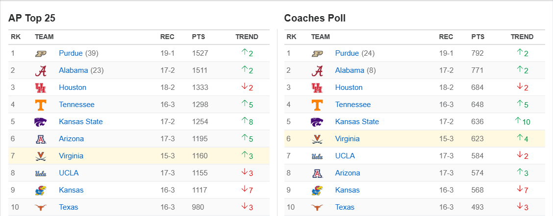 UVA up to #7 in the AP poll today, passing Texas, UCLA, and Kansas.