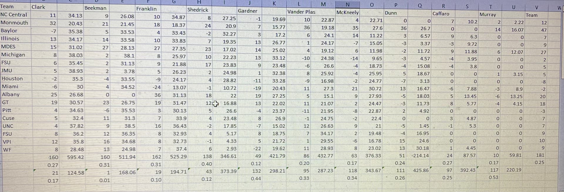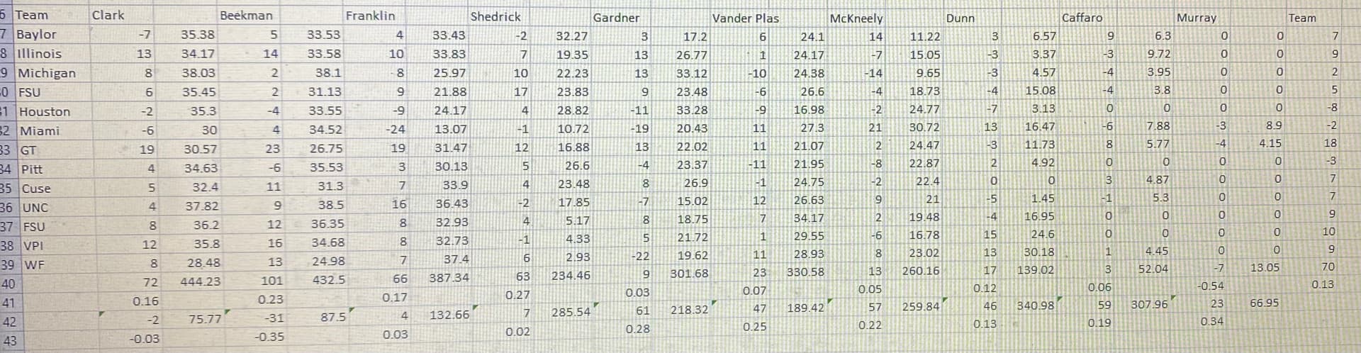 Our others who are in positive territory — differential between being on-court vs. off it — are Clark (+0.10 per minute), Beekman (+0.30 per minute, Franklin (+0.21 per minute), and Caffaro (!!) (+0.02 per minute).