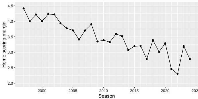 This look at whether home court advantage is increasing might be relevant to your questions: