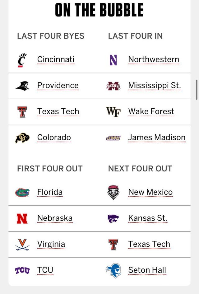 Weâve lost to one for sure non-tourney team (Notre Dame) and that was on the road so not a killer. Wiscy and Memphis are top 15 teams and State College is gonna be a tourney team IMO. Iâm not surprised we are on the bubble. Just hope we stay in the conversation all year long if not lock ourselves back in it.