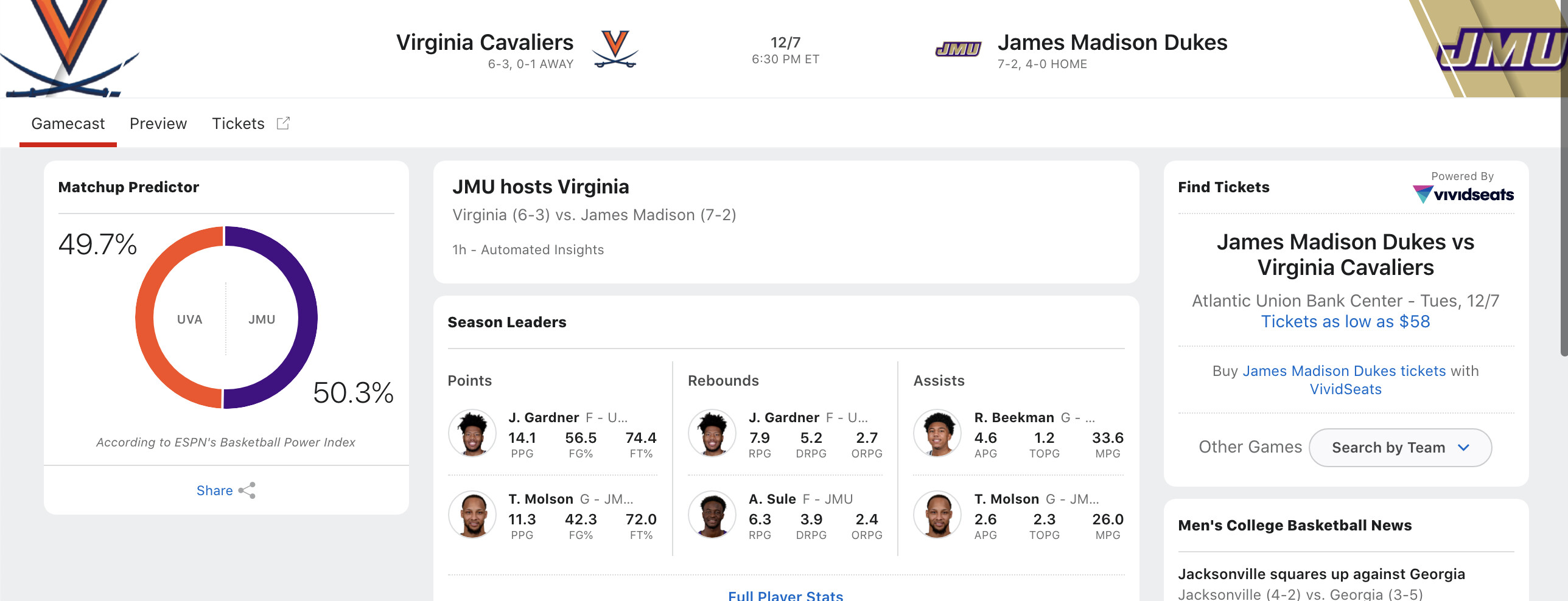KenPom thinks UVA is -5. If I was a betting man (which I’m not, especially boy against UVA, though I did talk my dad into betting on ND), I’d take JMU and the points.
