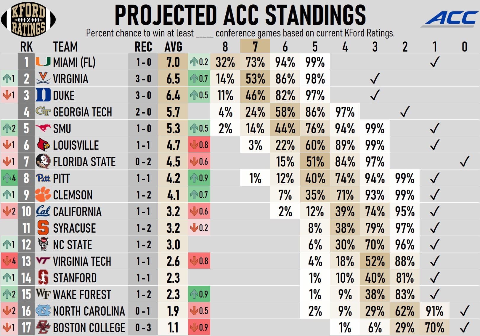 Our full projection sheet isnāt out yet, but Ford now has us as the most likely second place team with a slightly better chance to win 7 or 8 conference games than Duke. Duke playing Clemson and GT (in back to back weeks, no less) is probably our saving grace. I guess we want them to lose both of those? But a loss to GT just puts GT there but closer I would assume.