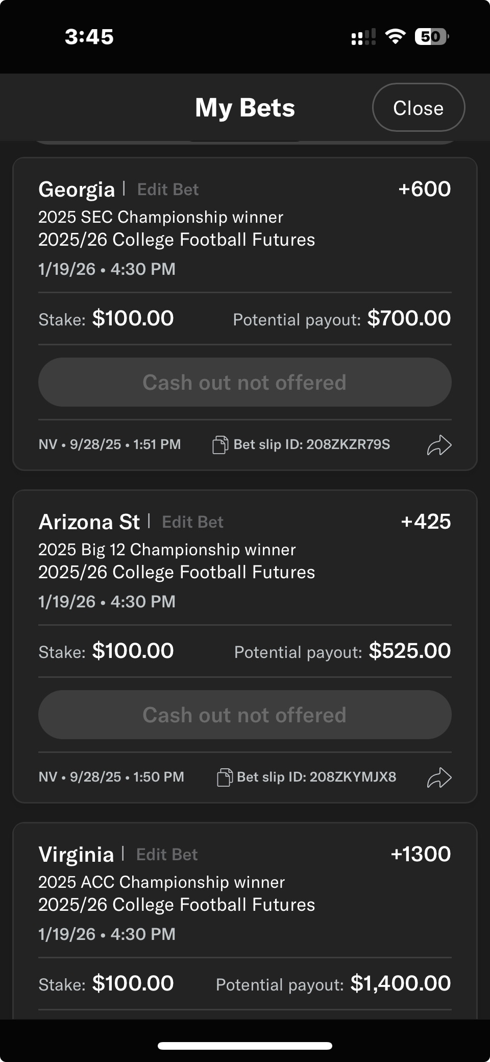 For SEC championship Iām liking A&M as a bet (I have a preseason bama ticket though that Iāll probably ride out). Theyāve been a better team than everyone left in their schedule. The question is if theyād be able to beat whoever is sitting at the end of the line for them