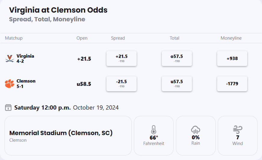 -21.5 seems very aggressive. UVA either covers or gives up some garbage points to Clemson in the 4th.