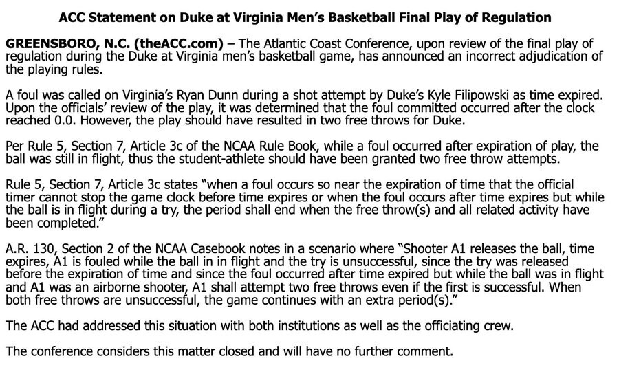 The ACC understands the passion and dedication of our fan base, and we share in the commitment to the highest standards of collegiate athletics. We want to assure our stakeholders that a thorough review of the officiating during the UVA vs. Louisville game is currently underway. The integrity of our athletic competitions is paramount, and we are dedicated to addressing any concerns that may compromise that integrity.