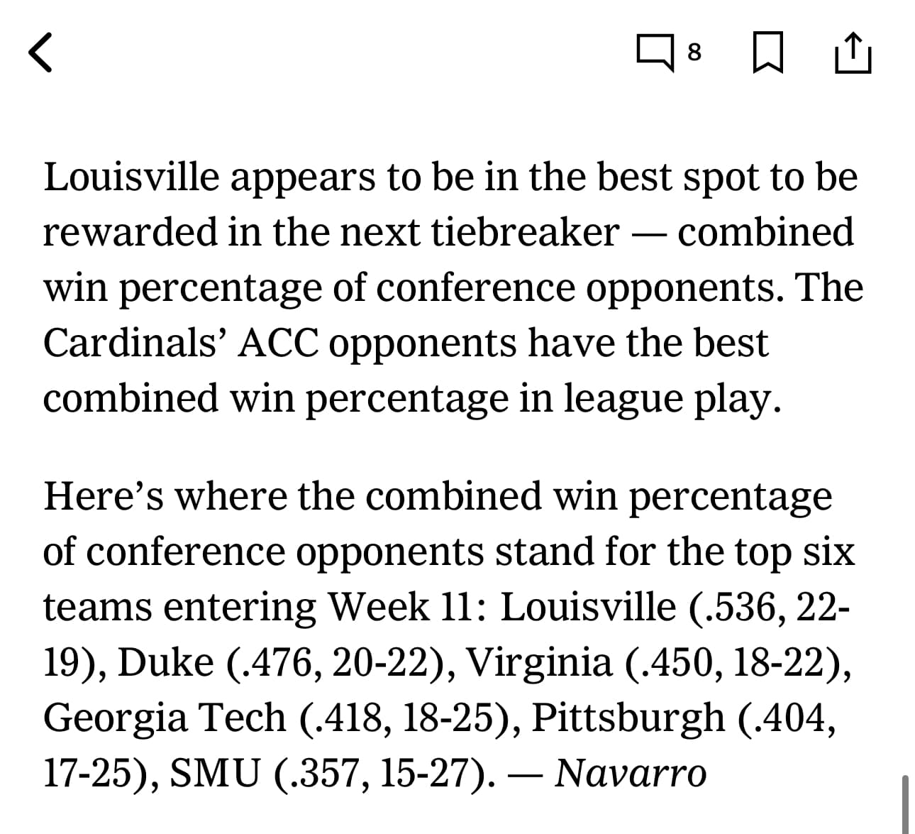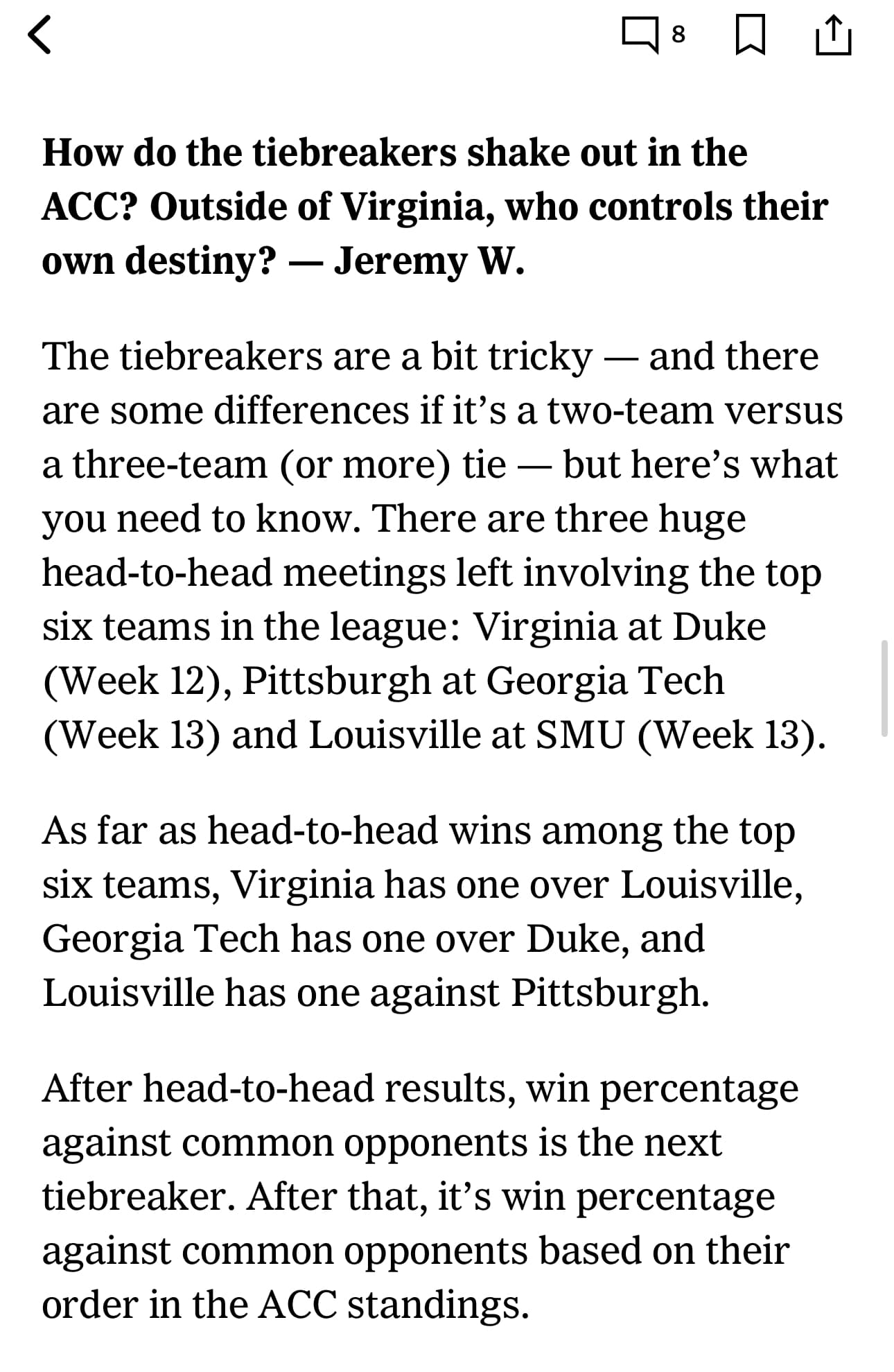 The Athletic had an ACC mailbag today, and one of the questions addressed this. Basically, it’s complicated. Like @BDragon said earlier up in the thread, Virginia just needs to keep winning.